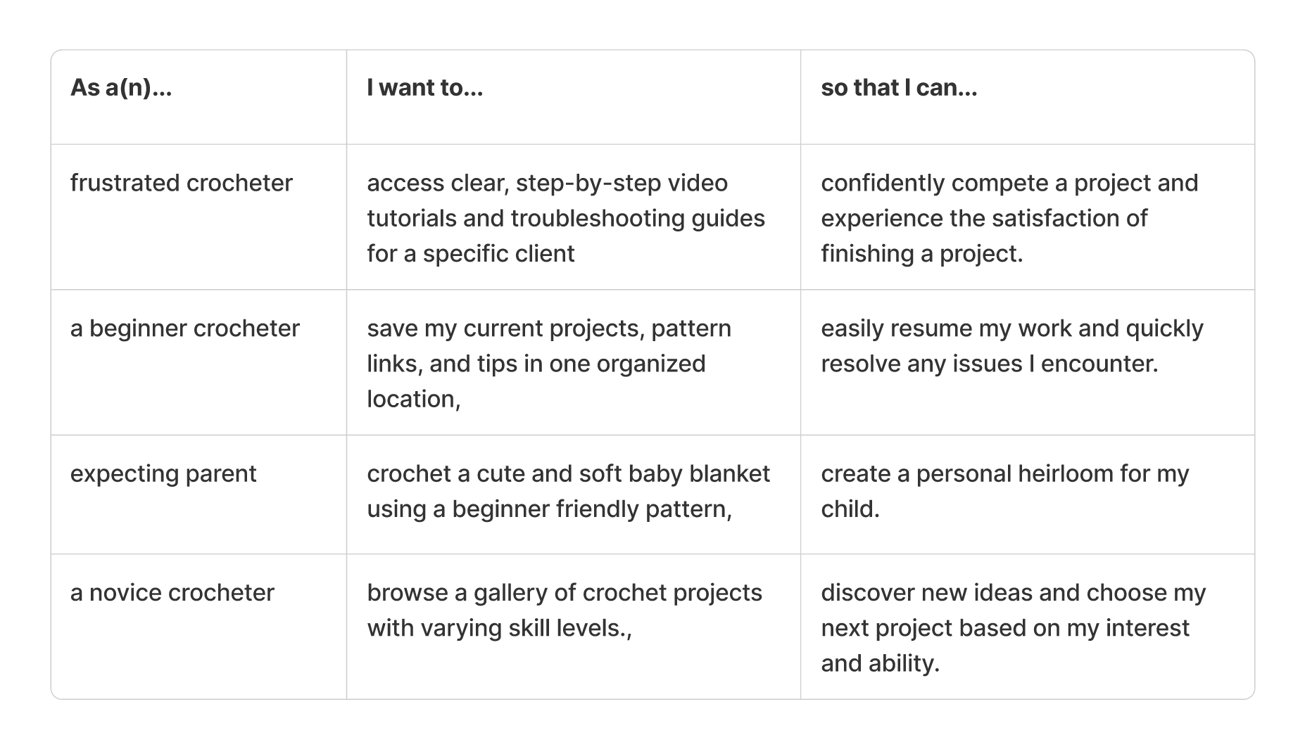 Most users learned crochet through friends and family, and those connections served as a common motivation among all interview participants (ex. crocheting gifts for loved ones), and as a way to ask questions when they feel stuck.