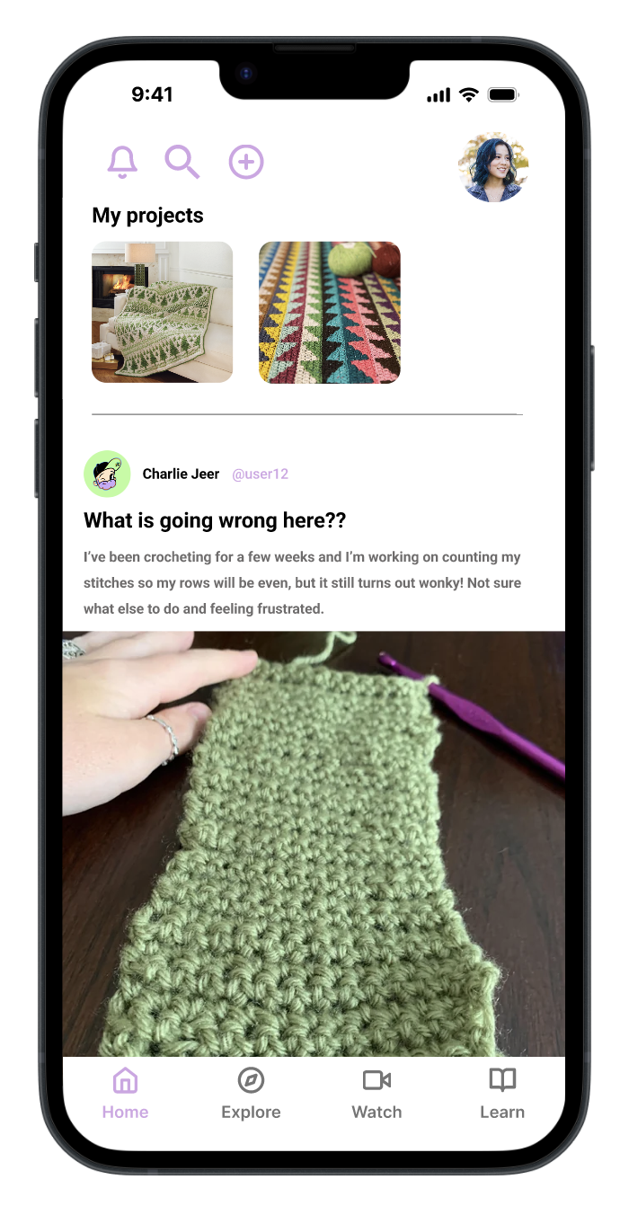 Within a close circle of crocheting friends and family, users can share questions, challenges, and celebrate successes.